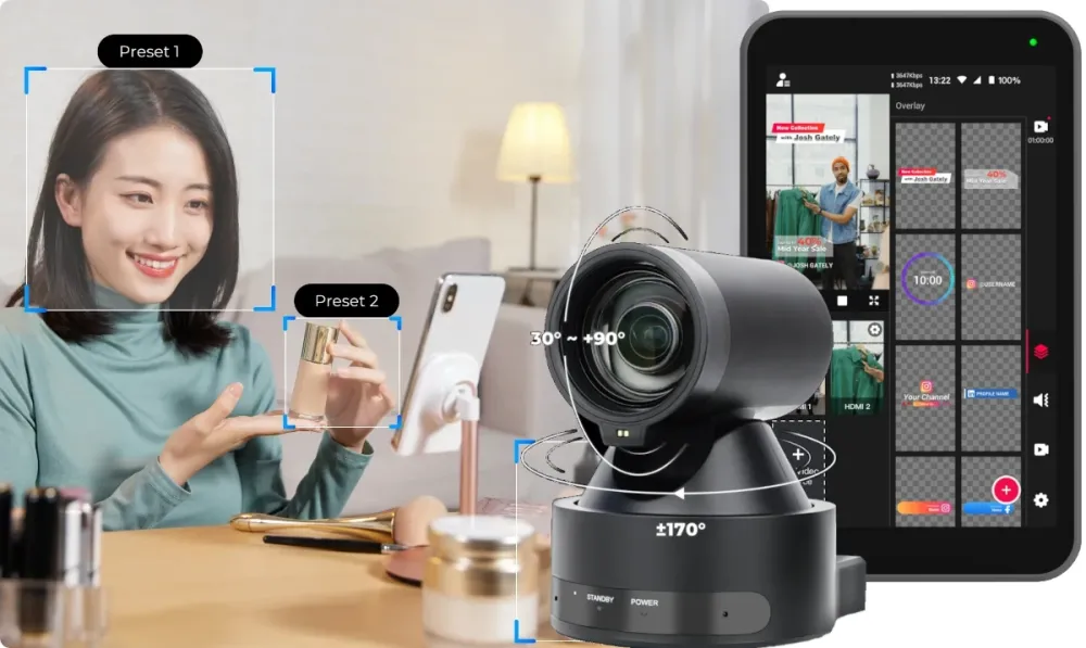 - Ідеально для вертикального формату: PTZ-камера VertiCam розроблена спеціально для вертикального відео, забезпечуючи співвідношення сторін 9:16, автоматичне фокусування, широкі можливості віддаленого кадрування з об'єктивом 12х, і швидке перемикання на попередньо збережені пресети позиції.