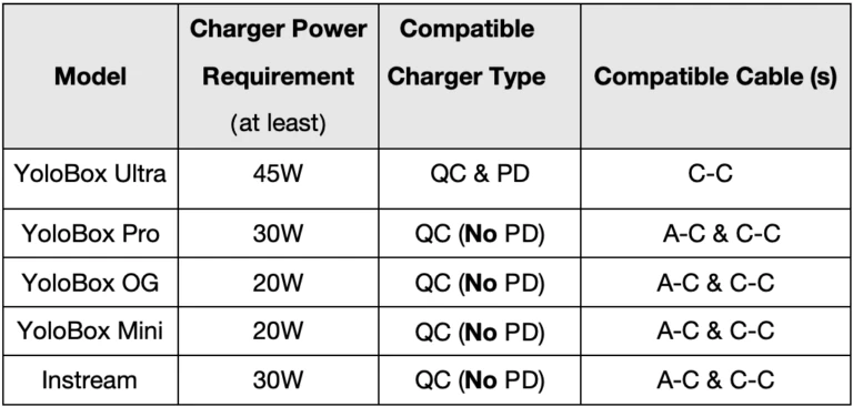 Нижче наведено список сумісних зарядних пристроїв та зарядних кабелів для різних моделей YoloBox: